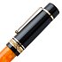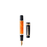 • Delta DV Original Mid-Size - Piston Fountain pen • Piston Filler screw mechanism • 14K Gold nib, gold plated • Made of black acrylic resin • Middle celluloid band is in the lava color of Vesuvius • Sterling silver mid cap ring with Roman decorative pattern • Spring-loaded clip with a rotating ring • Unique numeric code printed on the cap • One ink bottle included - Black • Made in Italy No writing instrument symbolizes the Italian attitude to life as strongly as the Delta Dolce Vita series. It has a body made of black acrylic resin that has been stored for at least 6 months and has unique properties in terms of feel, elasticity and heat conduction properties. The middle celluloid band is in the lava color of Vesuvius. The upper/mid cap ring is made of 925 sterling silver and shows an old Roman decorative pattern that was found during excavations in Pompeii.