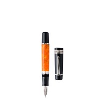 • Delta DV Original Mid-Size - Piston Fountain pen • Piston Filler screw mechanism • 14K Gold nib, palladium plated • Made of black acrylic resin • Middle celluloid band is in the lava color of Vesuvius • Sterling silver mid cap ring with Roman decorative pattern • Spring-loaded clip with a rotating ring • Unique numeric code printed on the cap • One ink bottle included - Black • Made in Italy No writing instrument symbolizes the Italian attitude to life as strongly as the Delta Dolce Vita series. It has a body made of black acrylic resin that has been stored for at least 6 months and has unique properties in terms of feel, elasticity and heat conduction properties. The middle celluloid band is in the lava color of Vesuvius. The upper/mid cap ring is made of 925 sterling silver and shows an old Roman decorative pattern that was found during excavations in Pompeii.